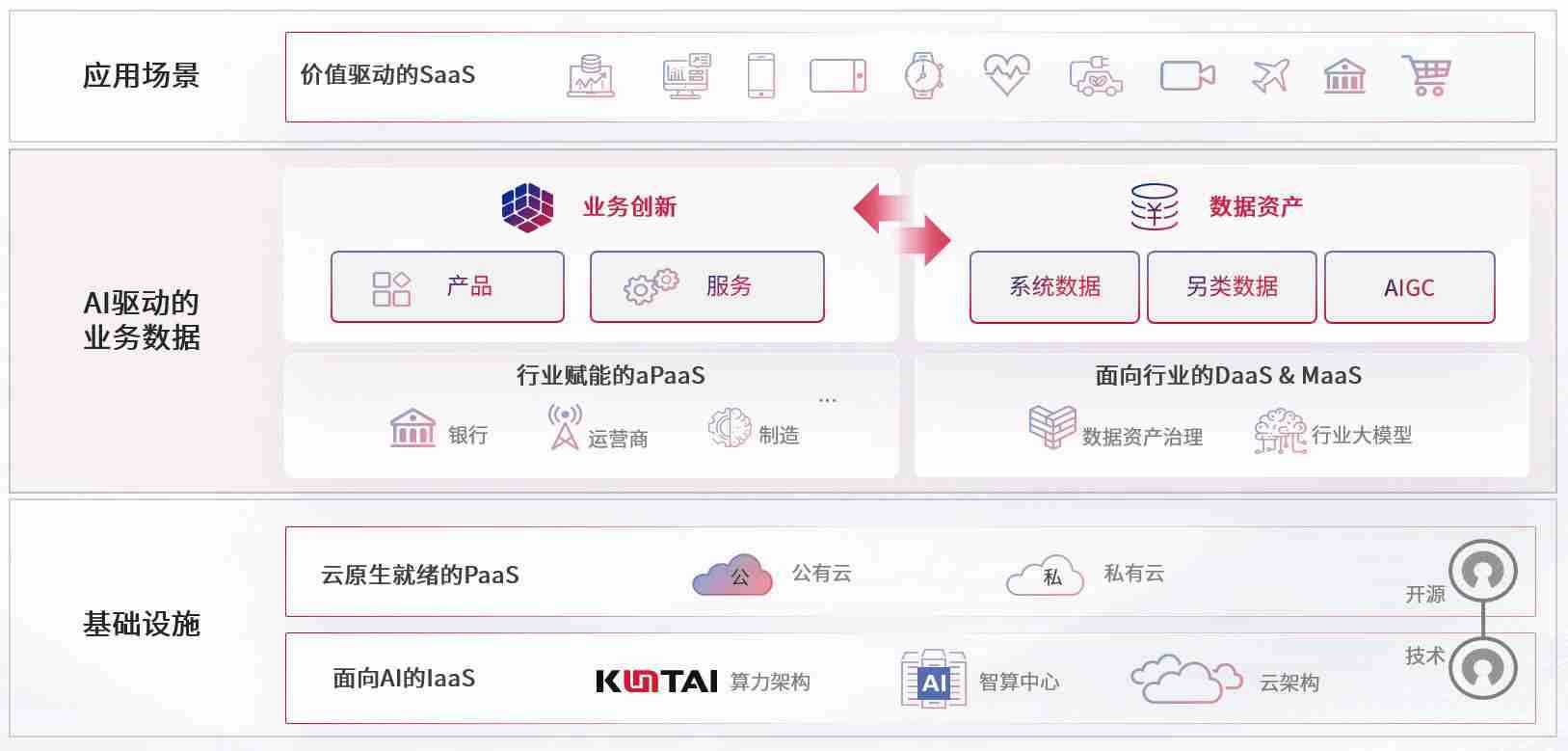 数字时代,,围绕企业数字化转型的关键要素,,伟德国际1946bv数码开创性的提出数云融合战略和技术体系框架,,着力在云原生、、数字原生、、、、AI原生和信创产业上架构产品和服务能力,,,为处在不同数字化转型阶段的快消零售、、汽车、、、金融、、医疗、、、、政企、、教育、、、、运营商等行业客户提供泛在的敏捷IT能力和融合的数据驱动能力,,,构建跨界融合创新的数字业务场景和新业务模式,,助力企业级客户建立面向未来的核心能力和竞争优势,,,,全面推动社会的数字化、、、、智能化转型升级。。。