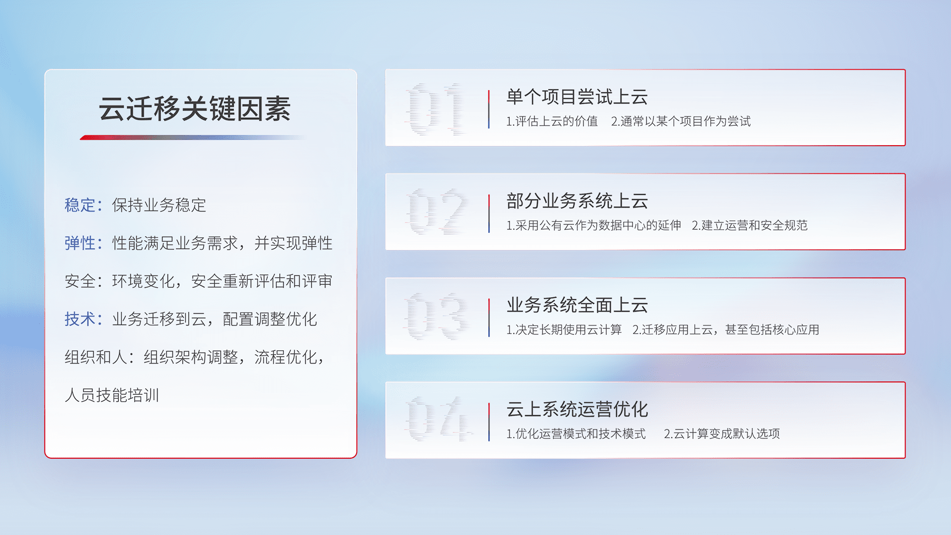 结合实际业务,,,,从规划设计、、、、云平台选型、、、云原生改造、、数据迁移、、、集成交付,,,,迁移全过程为客户识别最佳上云路径,,,,做好风险识别管理,,,,设计网络架构、、身份权限、、安全审计合规、、、、操作审计、、日志审计、、、、监控告警策略、、、多站点容灾设计等,,,对云上基础设施进行整体规划,,,,提升IT治理水平,,,以满足弹性、、高可用、、高性能的需求。。。