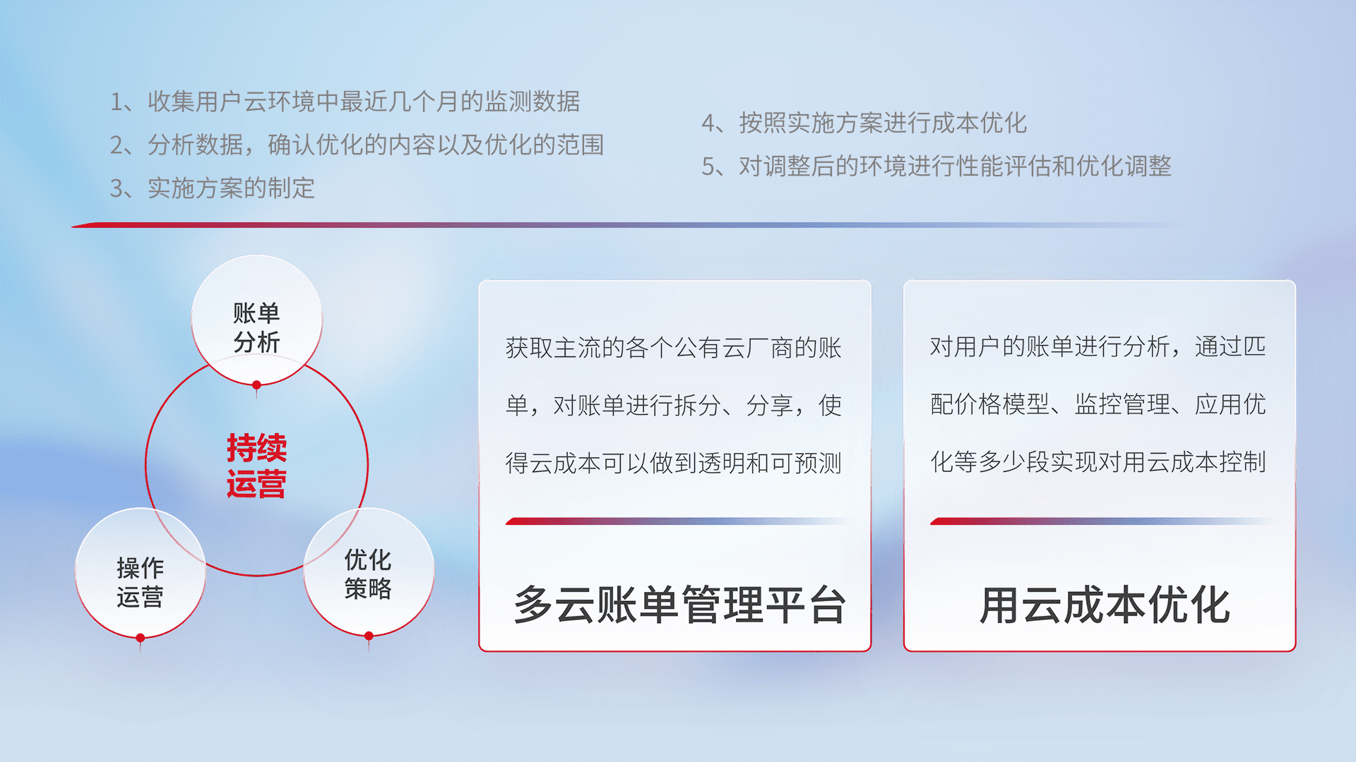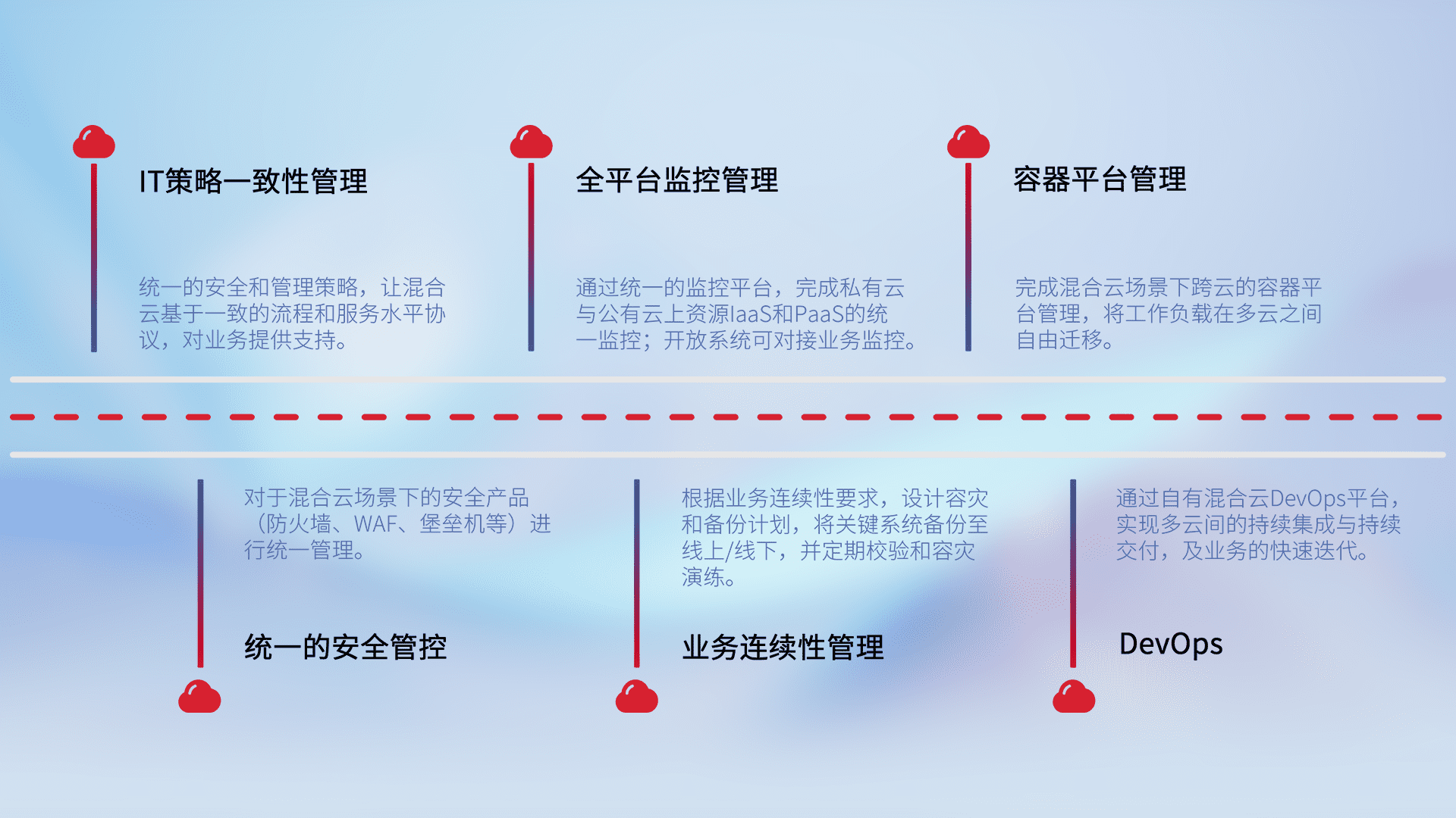通过多云纳管,,,以统一的资源数据模型把客户的云资源进行抽象和封装,,,,进而实现对多云资源的统一操作,,,,保障云资源管理的可靠性、、、、稳定性与可用性。。。量身定制化运维内容,,,配置、、、、开发运维、、补丁管理、、、备份、、监控、、认证和访问管理、、、审计和日常巡检等,,,,保障在用云过程中的可靠度,,,稳定度以及高可用率。。